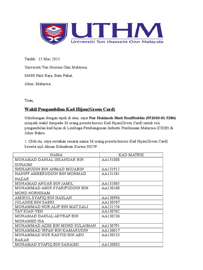 Contoh surat wakil cidb. Kursus Induksi Keselamatan Secara Online e-SICW Seminar. Match case Limit results 1 per page.
